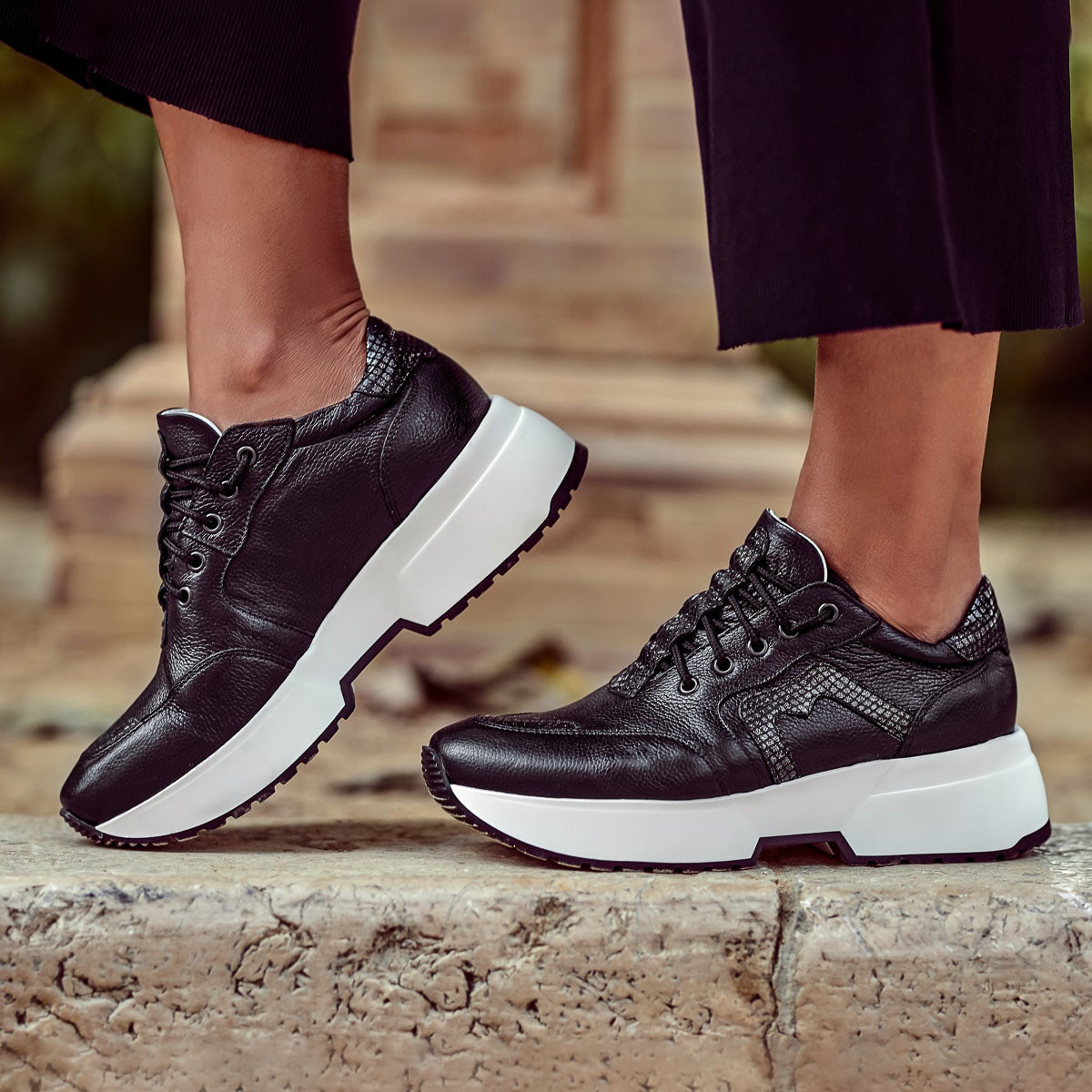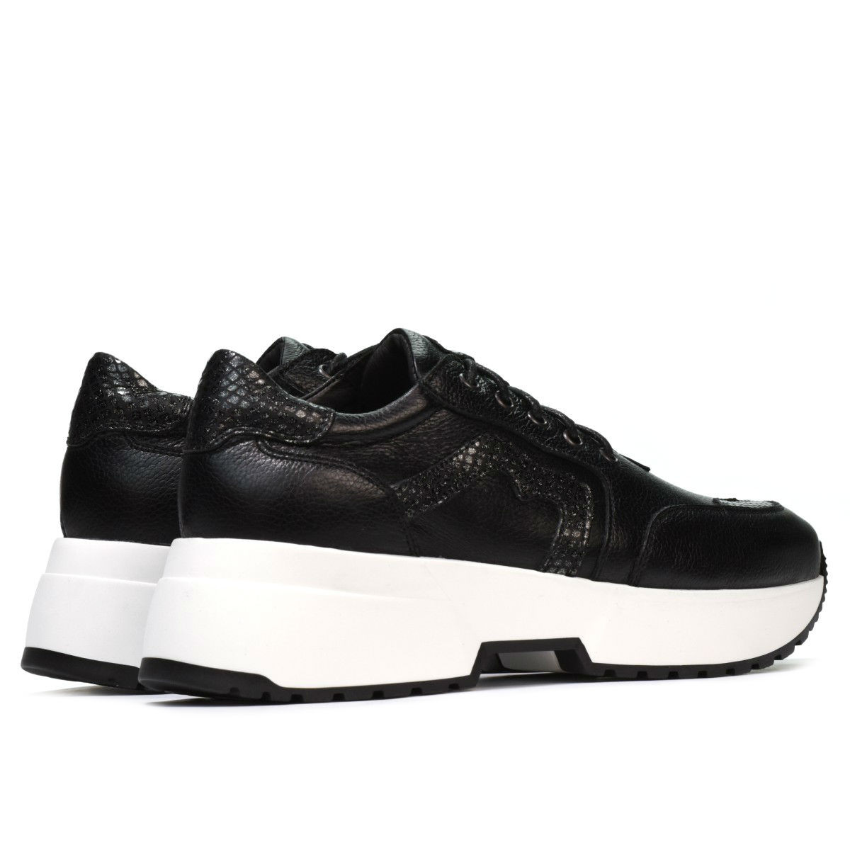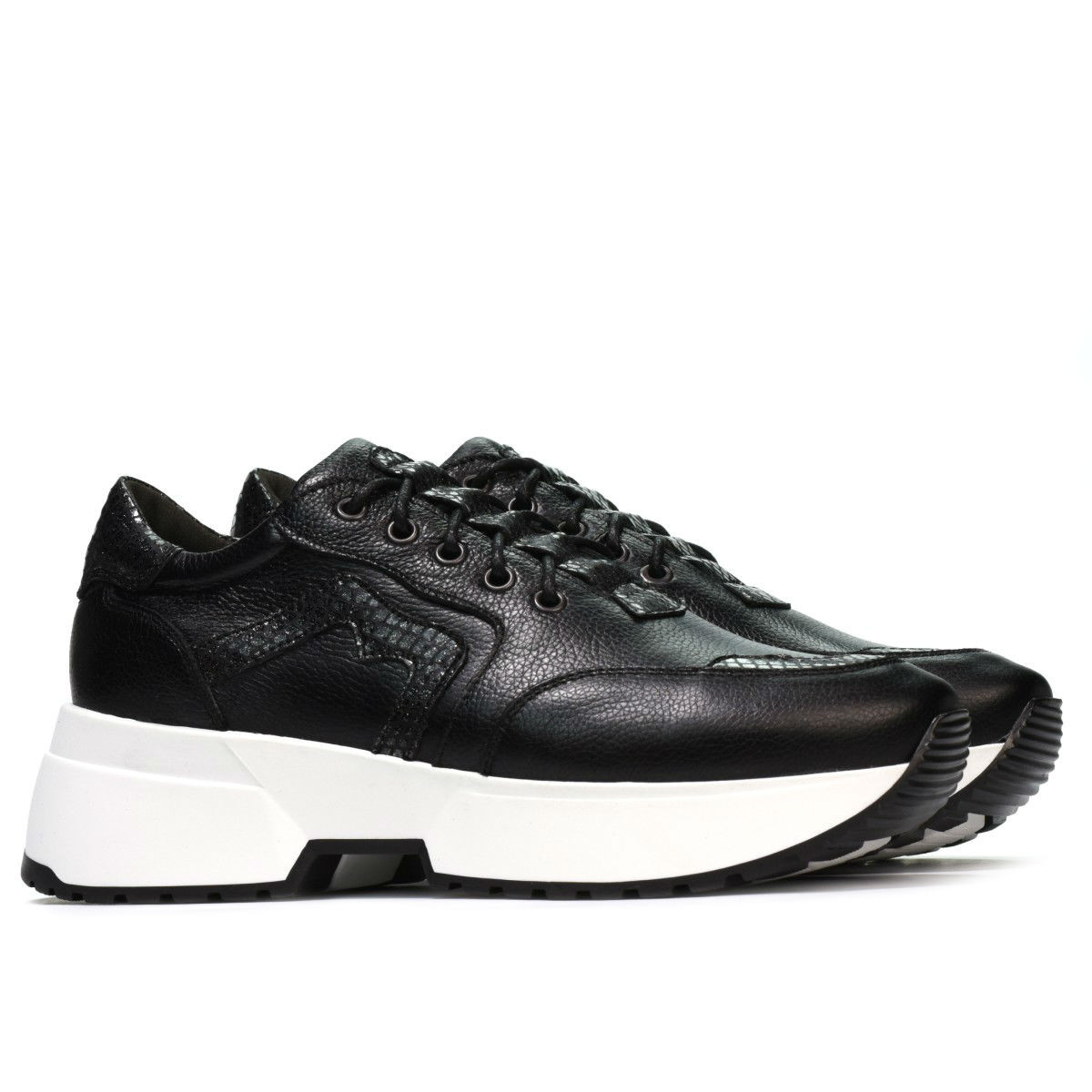Chaussures de sport pour femmes en cuir naturel. La semelle légèrement haute vous donne une hauteur supplémentaire tout en étant douce et très confortable à la fois. Les empiècements en cuir nacre sont l'attrait de ce modèle. Marelbo – qualité et raffinement à prix fabricant.