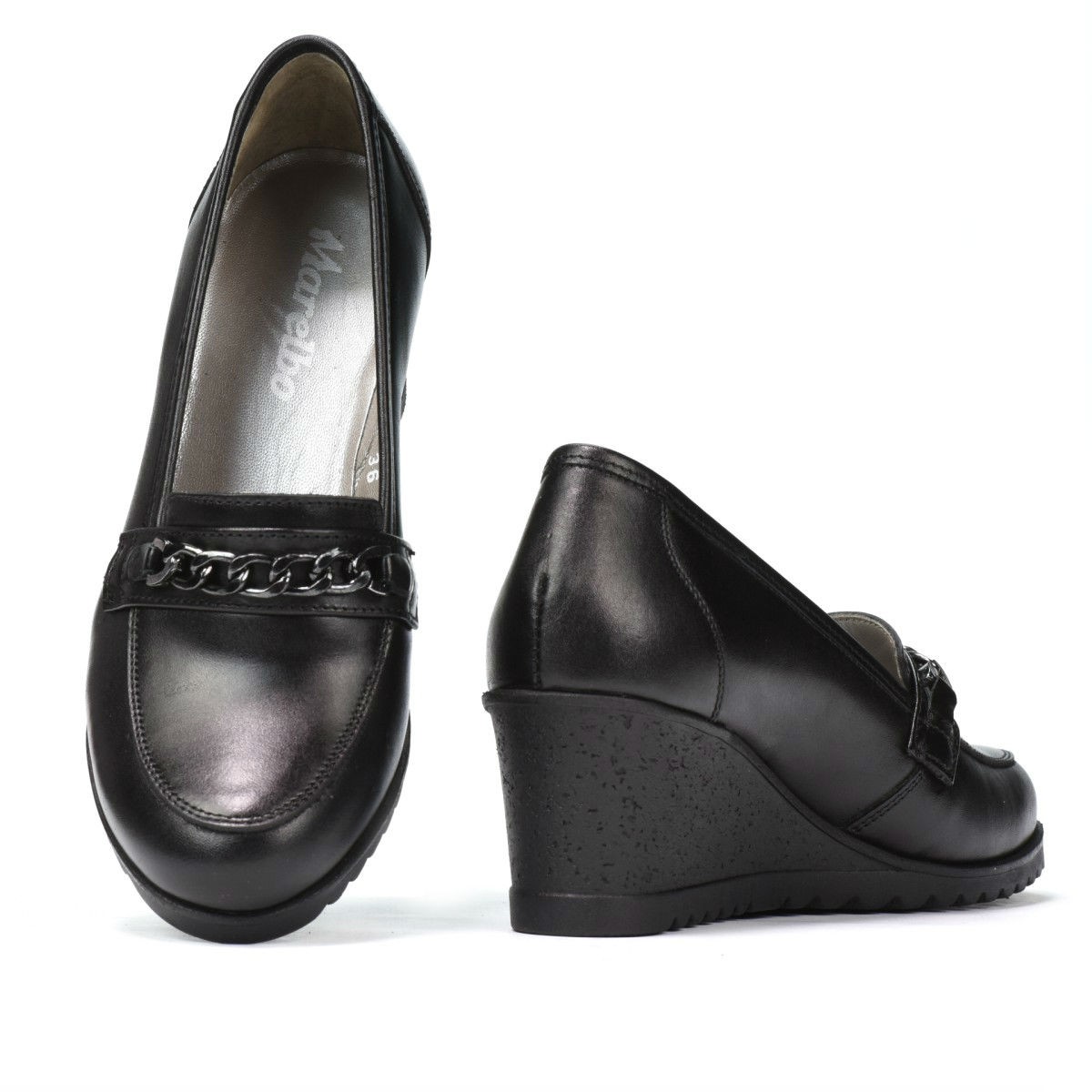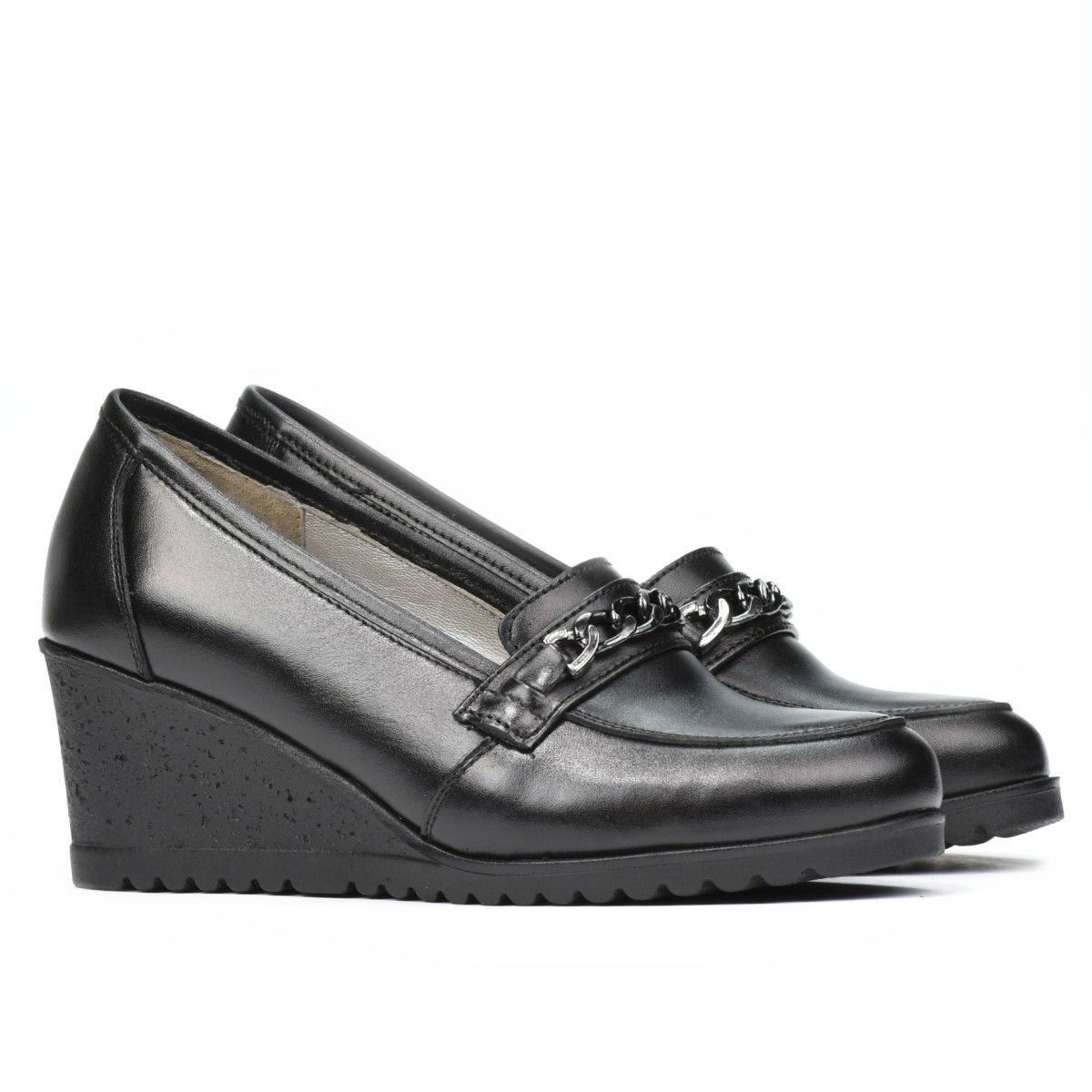 Chaussures décontractées pour femmes en cuir naturel. L'accent de ce modèle au design classique est donné par la chaîne en argent qui orne la partie supérieure. La semelle plateforme vous offre une hauteur supplémentaire ainsi que le confort dont vous avez besoin au quotidien. La qualité au prix du fabricant.