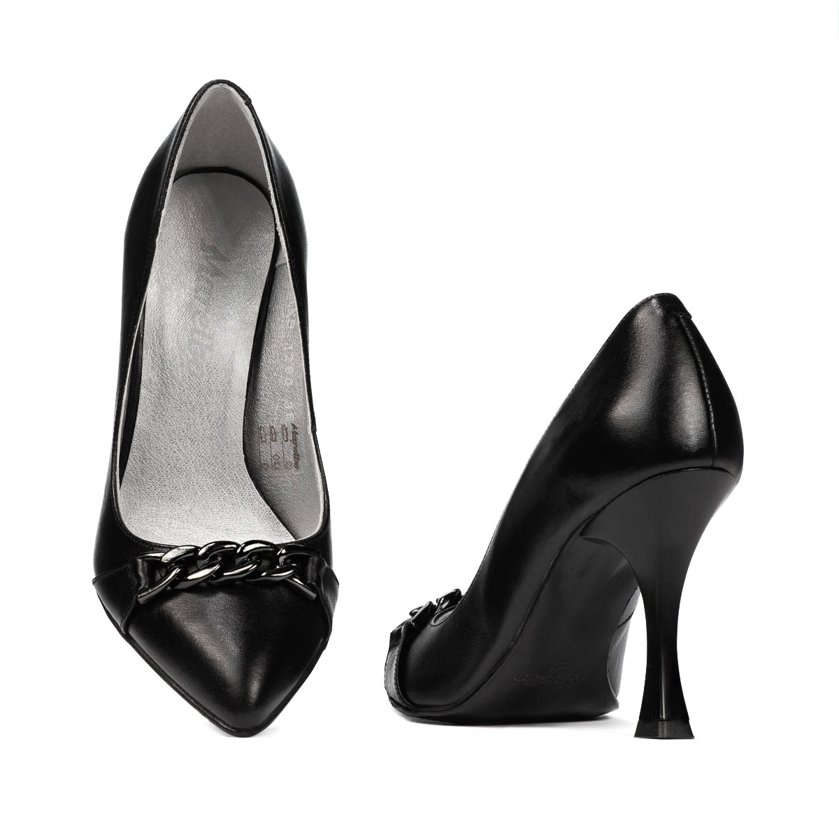 Chaussures élégantes en cuir naturel. Le talon évasé est stable et confortable toute la journée. Le style classique est accessoirisé avec une chaîne décorative. Avec un design simple mais en même temps attrayant, ce modèle ne devrait pas manquer dans votre collection. La qualité au prix du fabricant.