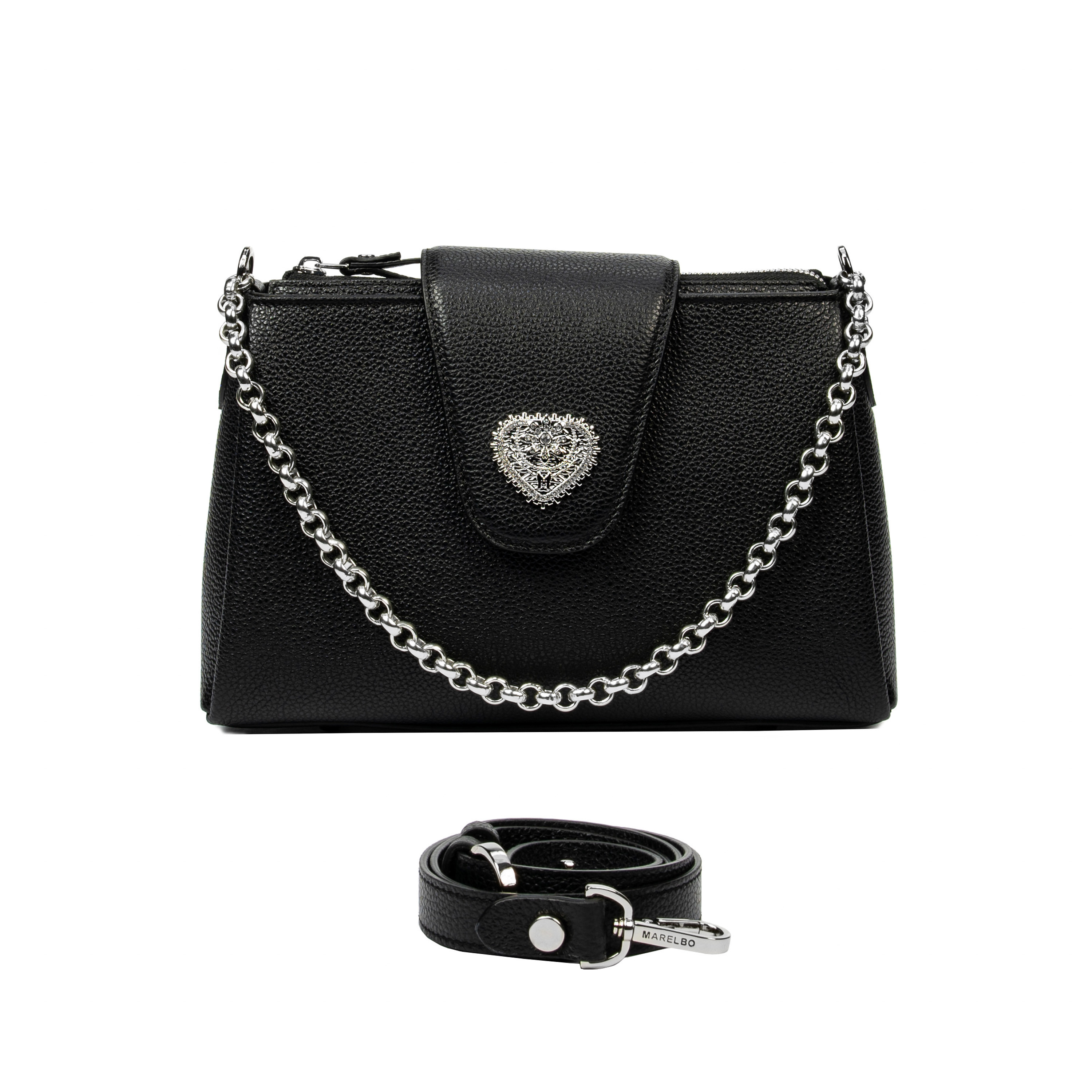 Ce sac à main en cuir naturel de la marque Marelbo se distingue par son apparence agréable et la qualité des matériaux utilisés. Le cuir naturel a une texture agréable au toucher, ce qui lui confère une présence particulière. C'est un sac approprié pour une utilisation quotidienne et pour diverses occasions. La chaîne métallique argentée et l'élément décoratif en forme de cœur attirent l'attention par leurs détails soigneusement travaillés. La fermeture est sécurisée, de sorte que les objets personnels sont en sécurité pendant le port. Les éléments métalliques sont résistants et conservent leur apparence au fil du temps. Commandez dès maintenant !